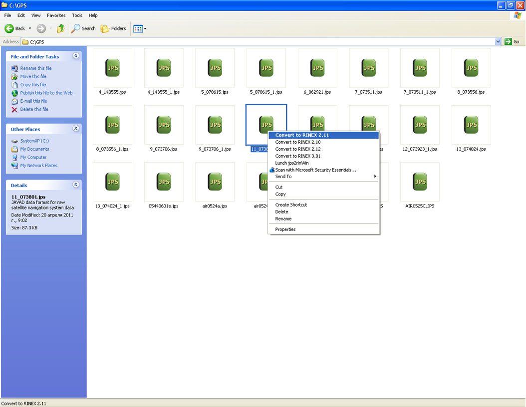 The software installation package setups all required parts of this program on Windows platform, sets the environmental path variable and creates association with JPS files. In Windows Explorer the context menu will have several new items "Convert to RINEX 2.1x" for JPS files. It goes without saying that JPS2RIN could be launched from command line too. Use "/wn" option to run it's GUI. To see all command line options please run jps2rin.exe /h.